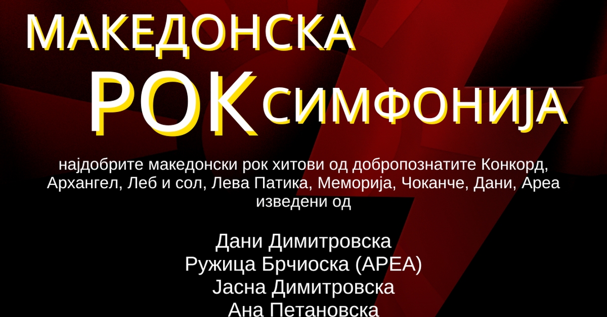 Македонска Рок Симфонија е настан на кој присутните ќе имаат можност да ги слушнат најдобрите македонски рок хитови од Архангел, Леб и Сол, Ареа, Лева Патика во изведба на НУ Камерен Оркестар на Битола и Дани Димитровска, Ружица (Ареа), Јасна Димитровска, Ана Петановска и Сашо Паркет.