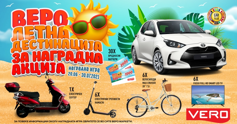 Почнувајќи од 20 јуни и заклучно со 30 јули, верните купувачи можат да учествуваат во „Веро летна дестинација за наградна акција”, секоја сабота да очекуваат вредни награди како електричен тротинет или ЛЕД-телевизор и да се натпреваруваат за последниот модел на тојота „јарис“.