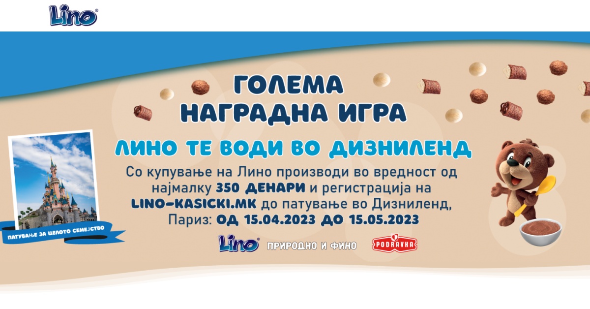 Во периодот од 15-ти април до 15-ти мај 2023 година со купување на било кој производ од брендот ЛИНО на Подравка во вредност од најмалку 350 денари можете да освоите патување за целото семејство во најпосетуваната атракција во Европа, Дизниленд, Париз. Главната награда е Лино пакет за семејството до четири члена кој вклучува хотелско сместување 4 дена и 3 ноќевања, билети за паркот Дизниленд, повратни авионски билети, трансфер до хотел и трансфер до аеродром.