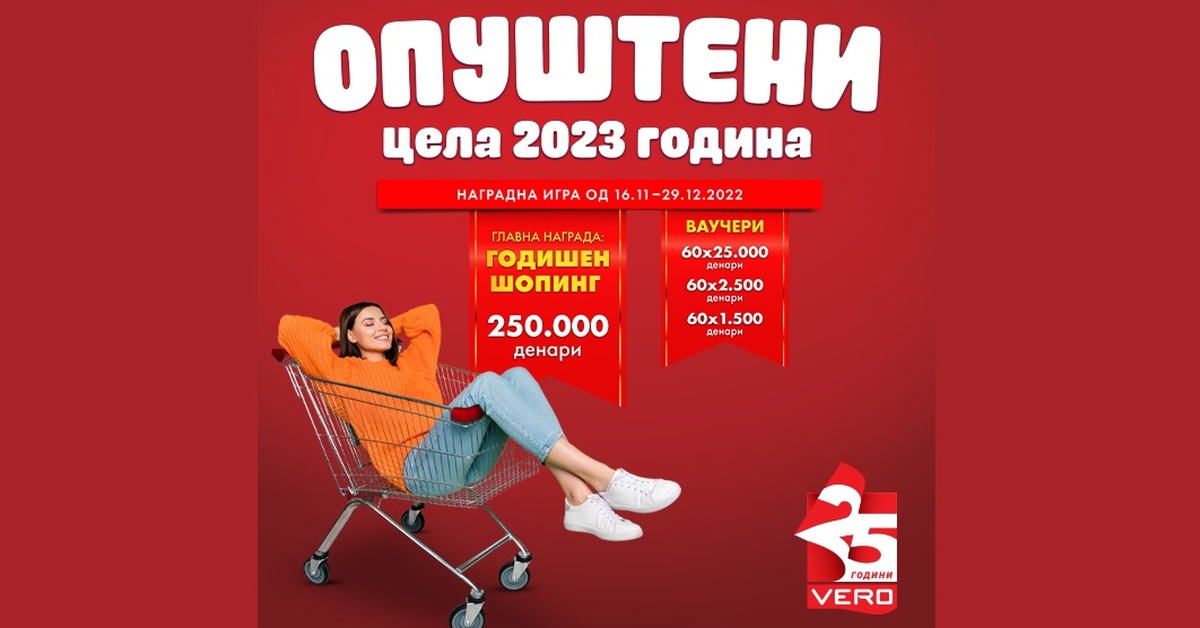 „Опуштено цела 2023 година“ е големата наградна игра за потрошувачите со која Веро ќе ја заокружи јубилејната роденденска година која беше полна изненадувања. Најголемото изненадување доаѓа на крајот – главна премија од 250.000 денари за најсреќниот потрошувач.