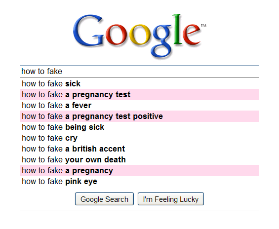 Доколку во полето за пребарување ги напишете зборовите how to fake (како да лажирам), ќе добиете интересни предлози. Дури три од предлозите се поврзани со лажирање на резултатите од тест за бременост. Тоа значи дека жените од цел свет активно се во потрага по начин за манипулирање на резултатите од тестот за бременост, за тој да покаже позитивен резултат.