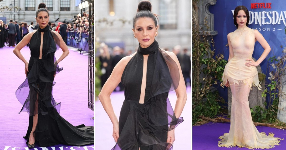 На вчерашната премиера по повод втората сезона на „Wednesday“, Кетрин Зета-Џонс и Џена Ортега го претворија пурпурниот тепих во моден театар каде гламурот, готиката и сензуалната елеганција се спојуваат во совршен баланс.