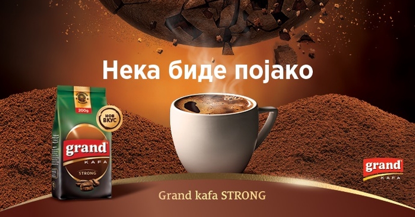 За сите љубители на јакото кафе со интензивен мирис и полн вкус кој долго трае, на полиците на супермаркетите ширум нашата земја се појави новото свежо мелено кафе Grand kafa Strong! Истовремено јакото и питко, а фино мелено кафе, е вистински избор за сите оние кои секојдневно посакуваат впечатливо доживување и вистинско уживање во моќниот мирис на омилениот црн напиток.
