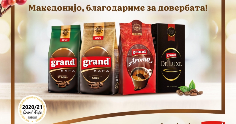 Истражувањата кои се спроведуваат на пазарот покажуваат дека потрошувачите имаат тенденција да ги одбираат брендовите кои добро ги познаваат, а кои им се лесно достапни, имаат проверен квалитет и изграден имиџ. Направено во Македонија од најквалитетните состојки, Гранд кафе е домашен производ на кој можете да се потпрете секогаш кога ви е потребен мирис и вкус на вистинско свежо мелено кафе, која наутро ќе ве освежи, а попладне ќе ви ја даде енергијата која ви е толку потребна во зафатениот ден кој следува.