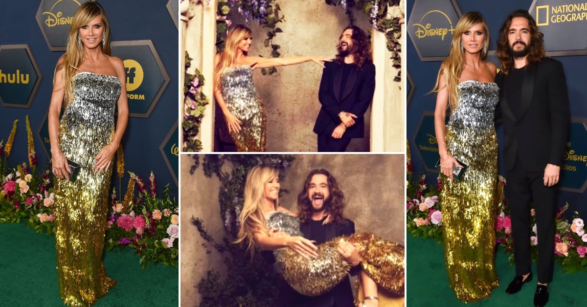 49-годишниот модел изгледаше атрактивно во креација со реси и омбре ефект од Долче и Габана, која ја надополни со накит од Лорејн Шварц. На настанот во Лос Анџелес, популарната манекенка беше придружувана од 33-годишниот сопруг Том Каулиц.
