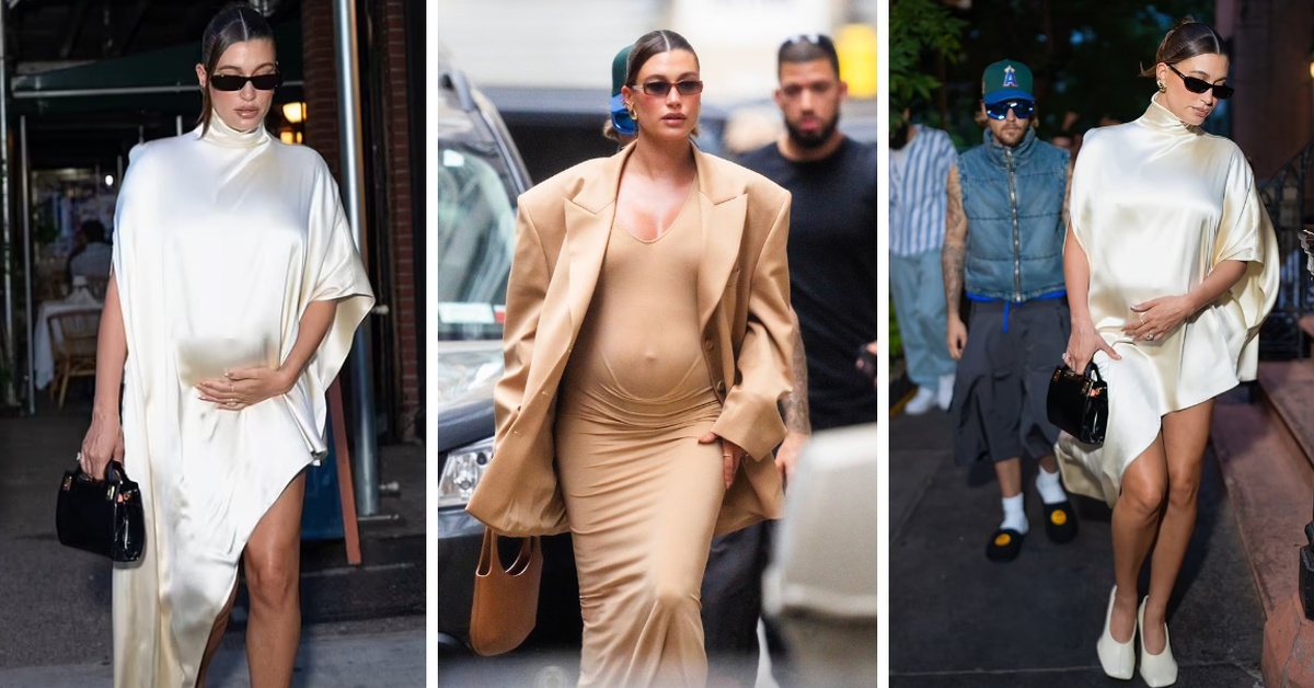 Хејли носеше асиметричен фустан во бисерна нијанса за вечерно излегување во саканиот. Таа постојано си го галеше пораснатото стомаче.