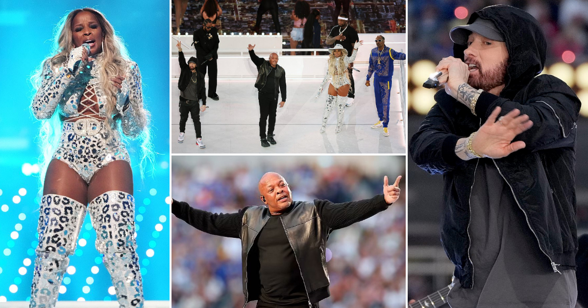 Шоуто го отвори 56-годишниот Доктор Дре со „The Next Episode“, а по кратко време му се придружи и 50-годишниот Снуп Дог. Раперот 50 Cent го изведе познатиот хит „In Da Club“, а 51-годишната Мери Џеј одушеви појавувајќи се во боди и високи чизми над колената. Потоа следуваа Кендрик Ламар со „Alright“ и Еминем со „Lose Yourself“.
