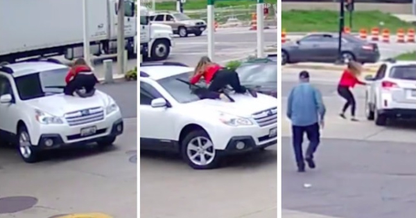 Хит видео: Жена скокна на хауба за да спречи кражба на нејзиниот автомобил, наиде на многу реакции