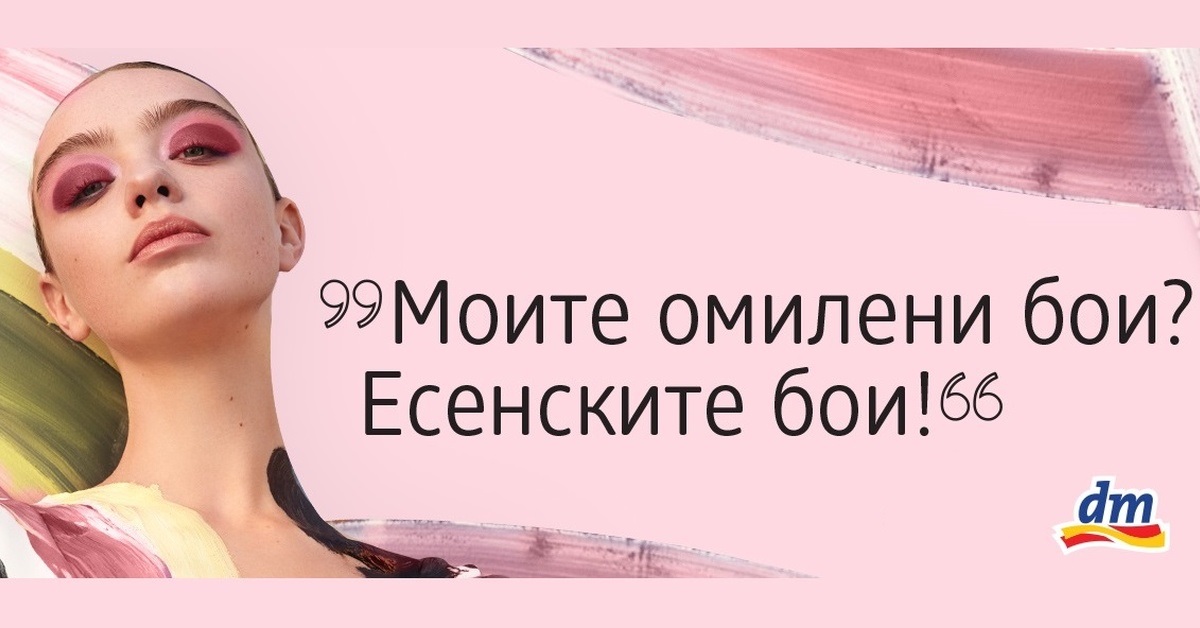 Со доаѓање на есента не престанува шаренилото од бои, нијанси, слободата во нивното комбинирање и храброста во создавање на нов и смел изглед. Напротив, треба да продолжиме уште посмело во нови предизвици, самоуверено и храбро! Главниот фокус оваа есен во dm дрогериите се токму боите и поттикот да се задржи шаренилото со слоганот: „Мојот свет останува шарен. Храбро, разиграно, во боја”. Акцентот е на шаренилото од бои, храброста во креирање нов изглед и фокусот на автентичноста која секој од нас ја носи во себе.