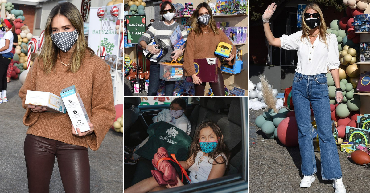 Во соработка со организацијата, трите хумани актерки претпразнично ширеа радост, делејќи им подароци на мајки и деца во автомобили. Џесика носеше кожни панталони и плетена блуза додека делеше детски играчки, како и пелени, шампони и влажни марамчиња од нејзината компанија Honest.