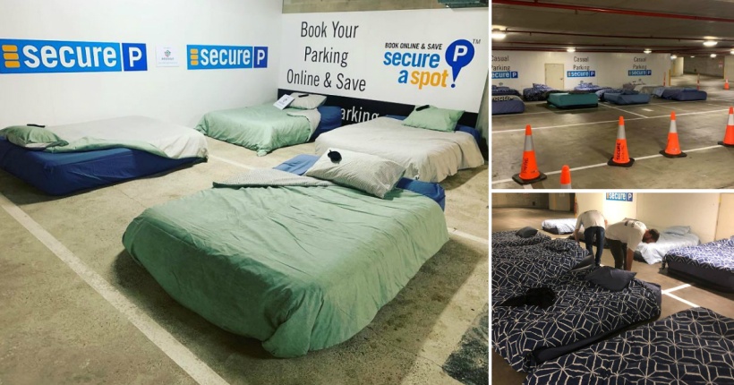 Волонтерите во добротворната организација од Бризбејн навечер претвораат подземен паркинг во безбедно засолниште за бездомните луѓе, поставувајќи им кревети и топли прекривки.