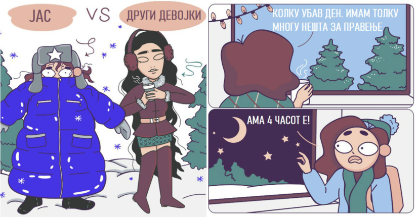 Деновите се кратки, времето е студено, облеката е тешка, возбудата за доаѓањето на празниците е голема, а атмосферата во нашите домови е топла и магична. Погледнете ги илустрациите на артистката Блум во кои ќе се препознаат многумина: