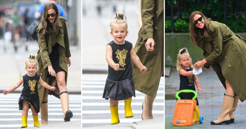 За прошетката во Њујорк, Ирина беше облечена во мантил од Барбери и гумени чизми од Шанел додека русокосото девојче носеше облека од Версаче и жолти гумени чизми.