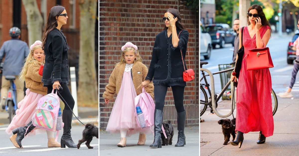 38-годишната манекенка беше „уловена“ од папараците со 7-годишната ќеркичка додека ја земаше од училиштето во Њујорк. Леа носеше розово фустанче со тул и складно венче на главата. Ирина беше облечена во црна комбинација со црвена чантичка.