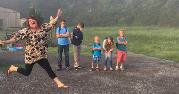 На двете фотографии објавени на Facebook, Американката Кешија Гарднер скока од радост пред четворицата синови и едната ќерка, кои се подготвени да тргнат на училиште по летниот распуст.
