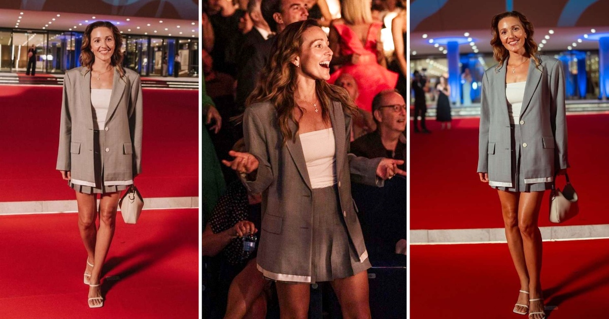 Таа носеше сив женски костум со кратко здолниште, а во својот стајлинг додаде и нежни бели сандали и чантичка.