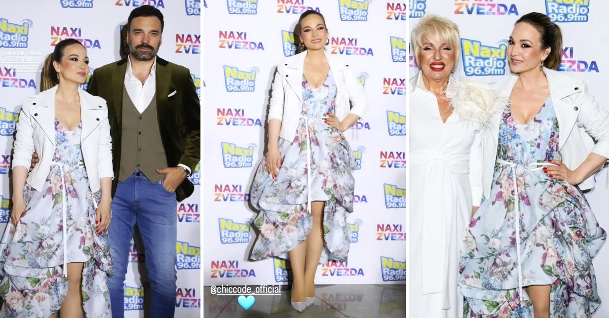 На настанот во „Театарот на Теразије“, српската пејачка изгледаше шармантно во син фустан со цветови и бело сако.