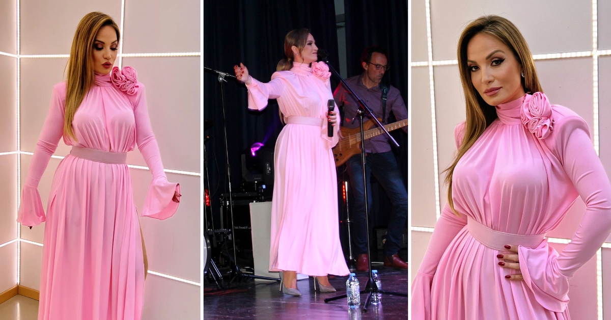 Во Домот на културата „Иван Мазов-Климе“, српската пејачка шармираше во розов фустан со 3Д цветови на едното рамо.