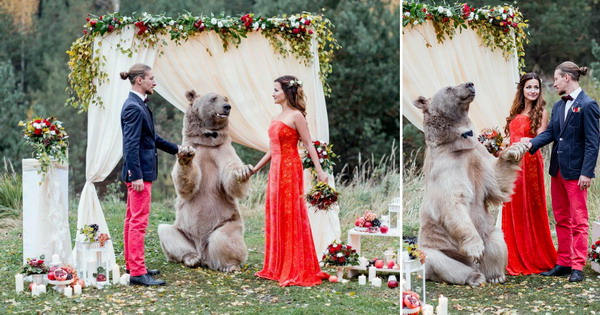 Денис и Нелја од Москва ја поканија мечката Степан на специјална церемонија. На фотографиите изгледа како мечката да ги венчава 30-годишните Руси.