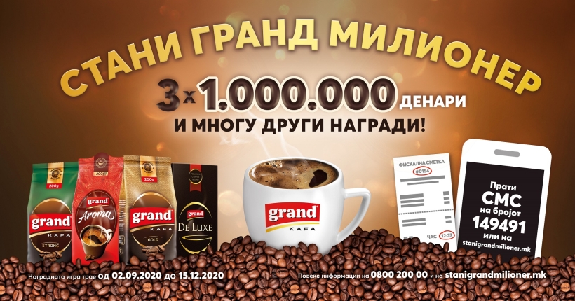 Што би направиле ако добиете милион денари? Секој човек барем еднаш во животот има помислено на ова прашање... А замислете го моментот кога ќе ве прашаат како станавте милионер, а вашиот одговор е „Се случи додека пиев кафе, буквално“. Звучи премногу лесно? Преку наградната игра „Стани Гранд милионер“, ја имате шансата да добиете еден милион денари само со испраќање доказ дека пиете од вашето омилено Гранд кафе.