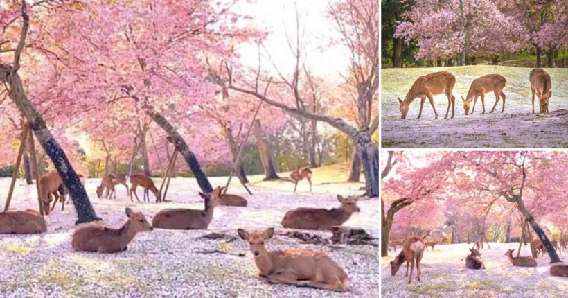 Бајковита сцена од срнчиња кои уживаат во празен парк со расцутени црешови дрвја во Јапонија мами воздишки.