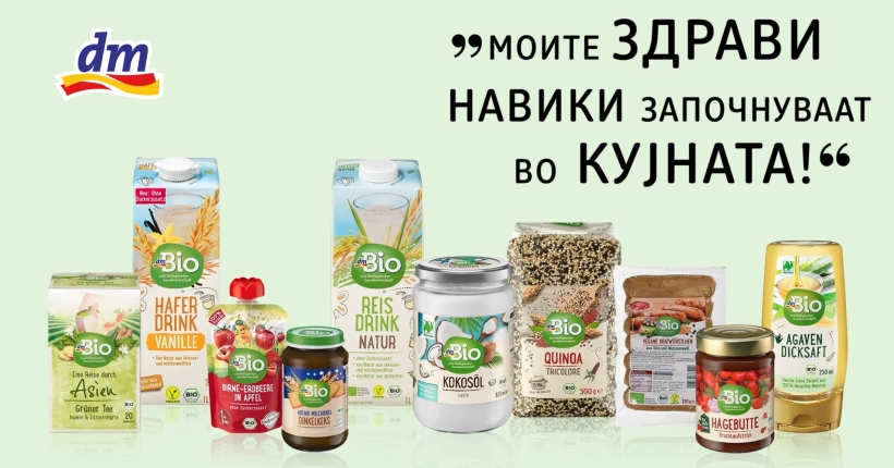 Сопствена трговска марка со најголем асортиман на органски производи во земјава е dmBio, која можете да ја најдете во сите дрогерии на dm. Со речиси 300 производи од органско потекло, dmBio Ви овозможува да го збогатите секој оброк со неверојатни природни вкусови, без разлика дали се работи за житарки, јаткасти плодови, тестенини или готови оброци. Доколку мислите дека сега е правото време за стекнување на поздрави навики, вистинско време е да ги пробате производите од асортиманот на dmBio.