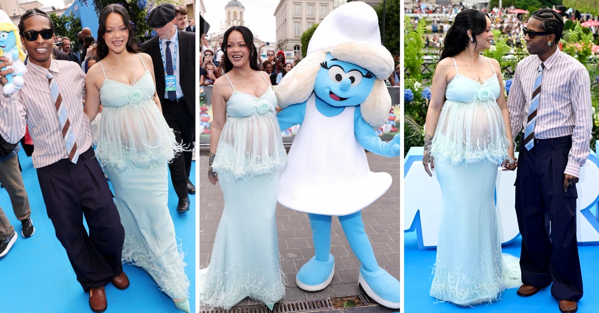 Како Штрумфета: Бремената Ријана во сино покрај Ејсап Роки на премиерата на „Smurfs“ во Брисел