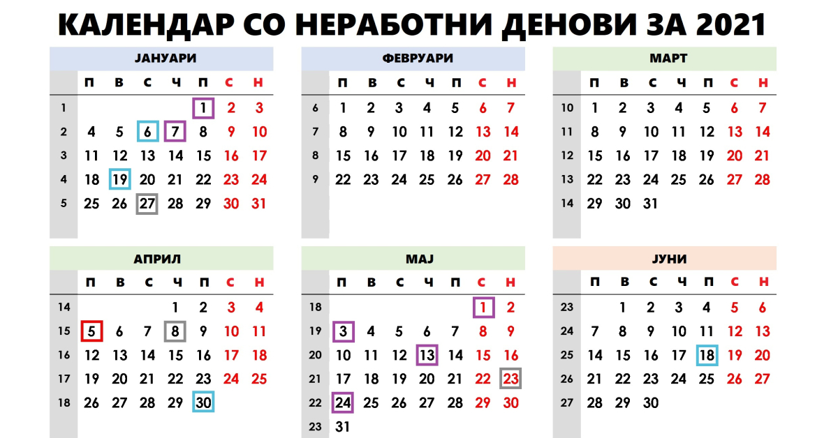 Согласно со Законот за празниците (Сл.весник на РМ број 21/98 и 18/07), во 2021 година неработни денови се: