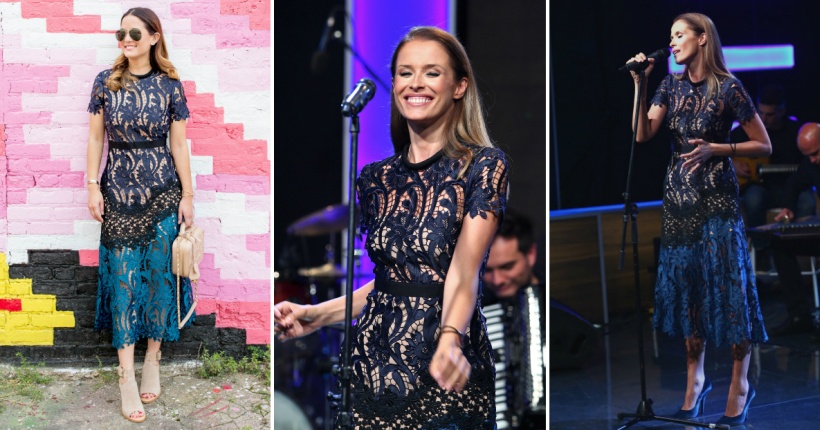 Креацијата од британскиот бренд, македонската ѕвезда ја искомбинира со обувки од брендот Ботега Венета. Деталите за стајлингот ги сподели нејзината стилистка Цаци Пакоска.