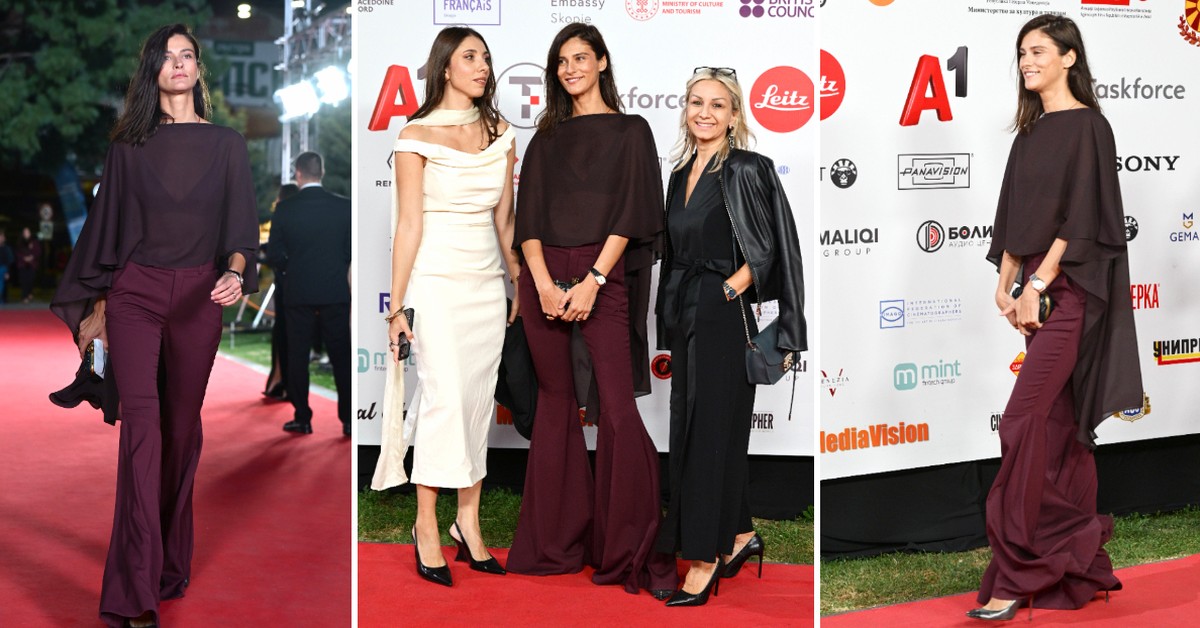 Македонската убавица се појави на свеченото затворање на Фестивалот на филмската камера во модерна комбинација во есенски нијанси. 37-годишниот модел шармираше во елегантни панталони тип ѕвонарки и проѕирен елегантен топ како наметка.