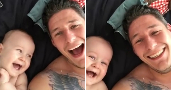 Во видеозаписот, малото бебенце заразно се смее на извиците на татко си. Потоа, се обидува и самото да ги повтори.