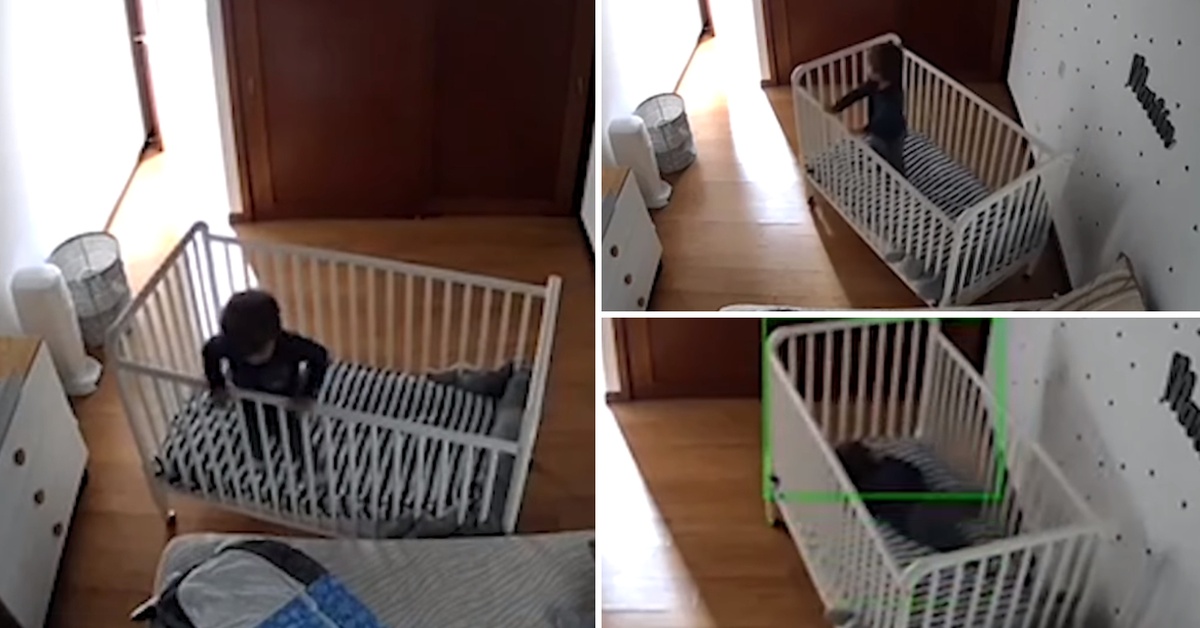 Во видео снимено од камера во детската соба, детенцето го турка креветчето со ногата на ѕидот, а потоа бавно, но сигурно го поместува до големиот кревет.