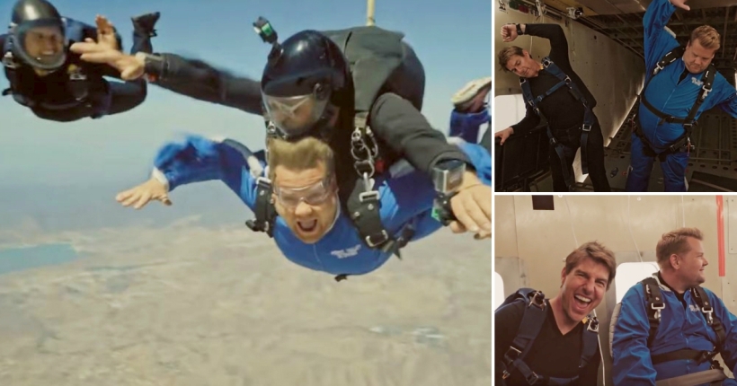Том Круз и Џејмс Корден скокнаа заедно од авион со падобрани, а видеото од нивната авантура измами многу насмевки кај нивните фанови.