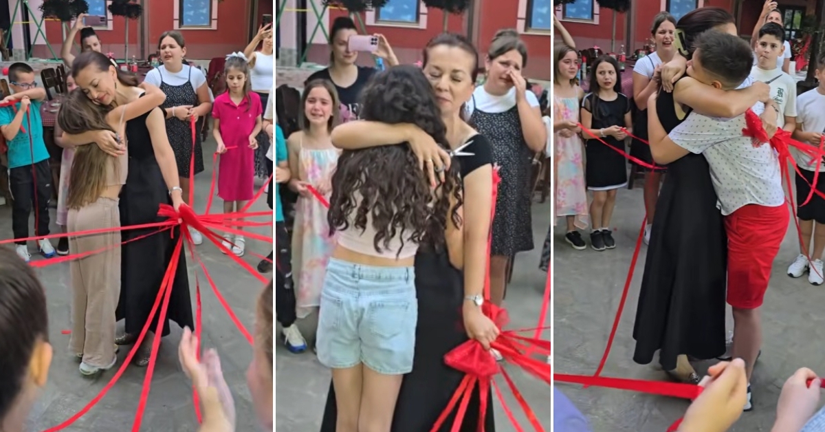 Видео од основно училиште во Прокупље, Србија, ќе ви ги насолзи очите. Во него, учениците од генерацијата 2014 држат црвени ленти кои се поврзани со нивната наставничка Драгана. Таа ги сече лентите една по една, ги прегрнува своите деца и ги пушта, давајќи им до знаење дека сега се подготвени без неа да продолжат да чекорат низ животот.