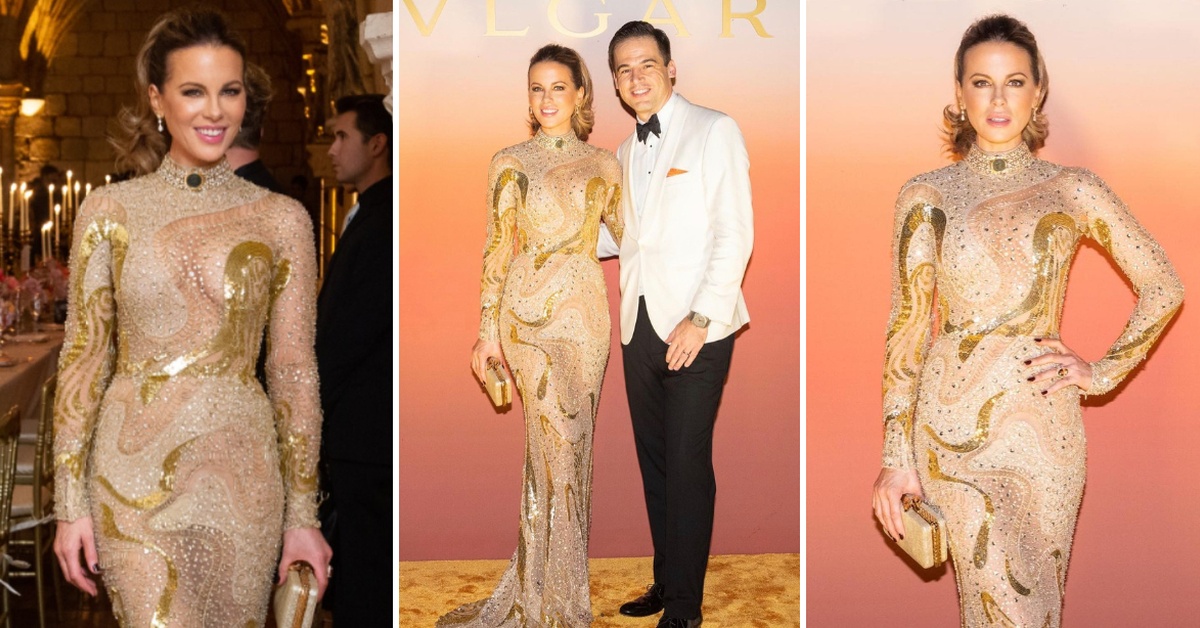 Златната креација, која доаѓа од колекцијата есен/зима 2021 на либанскиот дизајнер, Кејт ја искомбинира со луксузен накит од Bulgari и чантичка во златна нијанса.