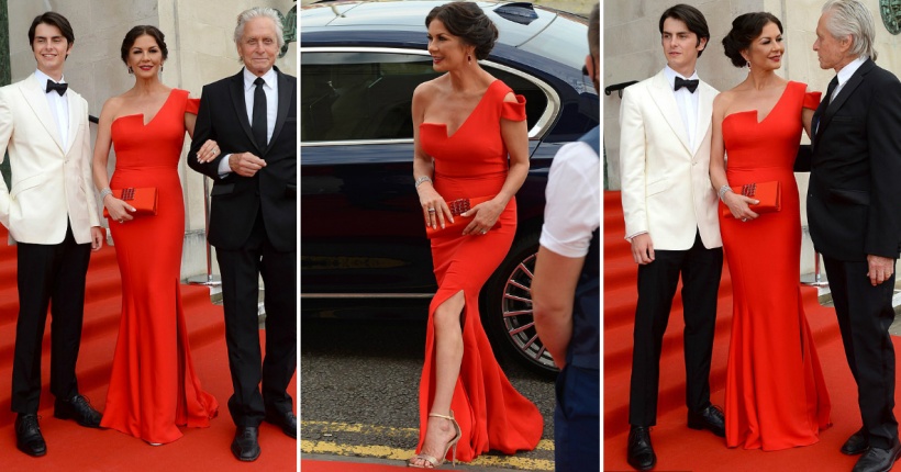 На церемонијата во Свонси, 49-годишната актерка беше придружувана од сопругот Мајкл Даглас и синот Дилан. Шармантната холивудска ѕвезда изгледаше прекрасно во елегантен црвен фустан.