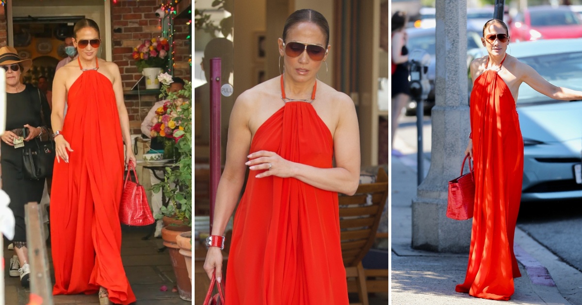 За ручек со пријатели во Лос Анџелес, 53-годишната ѕвезда избра широк комбинезон со разголен грб во воочлива црвена нијанса, а го искомбинира со обувки на платформа од Гучи и чанта од Ермес.