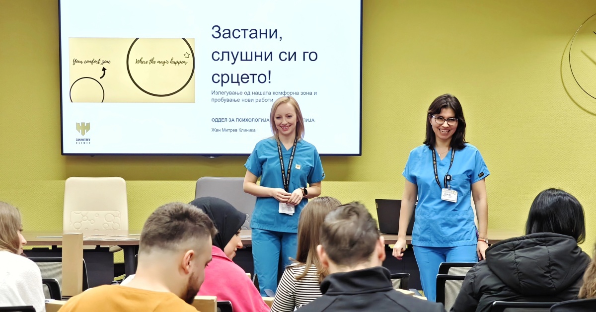 Психолошката работилница ја водеа и реализираапсихолозите и психотерапевти од Жан Митрев Клиника, доц. д-р Кристина Егуменовска и Александра Петроски. Покрај обуката за препознавање на знаците, на работилницата младите учесници размислуваа како да ја препознаат својата комфор зона и за начините како да ја надминат со цел личен раст и развој.