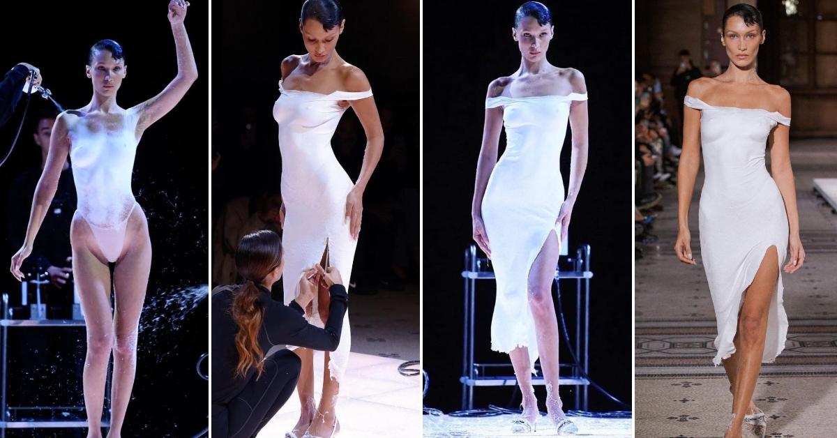На крајот од ревијата на која се презентираше колекцијата за сезоната пролет/лето 2023 во Париз, се случи нешто за кое сите зборуваат. Група научници и артисти за само неколку минути создадоа фустан директно на телото на Бела Хадид која стоеше топлес во центарот на модната писта.