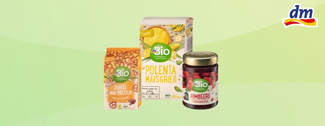 Понудата на dmBio е значително широка и богата, а меѓу актуелните производи се: палента, наут, природен напиток од овес, овесни снегулки од цело зрно, пире од домат, намаз од малини, мини переци од крупник и енергетски штанглици со кокос и црно чоколадо.