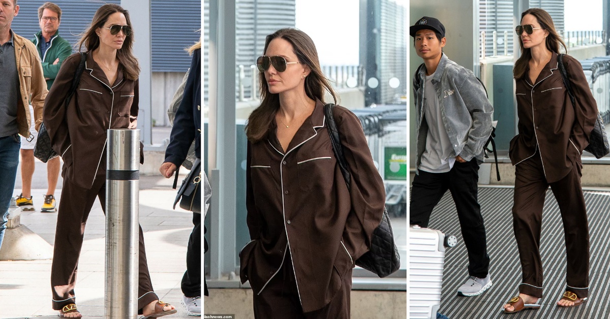 За претстојниот лет, Џоли имаше избрано многу комфорна комбинација во чоколадно-кафеава нијанса. Станува збор за комплет свилени пижами со потпис на Валентино кој чини 2.520 евра. Лежерната облека таа ја надополни со сандали во нијанса на карамела од истата модна куќа.