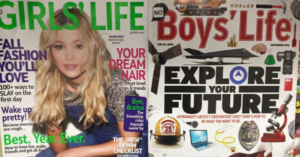 Татко сподели фотографија од насловните страници на списание за момчиња и списание за девојчиња со слично име (кои не се меѓусебно поврзани) и поттикна жестока дебата на интернет. На корицата од женското списание стојат наслови на содржини како „Косата од твоите соништа“ и „Разбуди се убава“, додека на машкото списание пишува „Истражи ја твојата иднина (станувајќи астронаут или пожарникар)“.