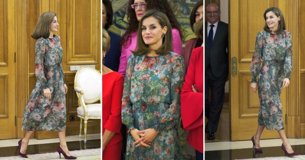 Цветниот миди фустан, кој Летиција го искомбинира со пурпурни салонки, чини