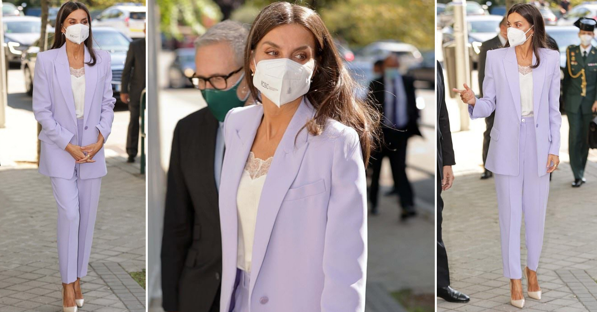 49-годишната Кралица изгледаше софистицирано во виолетов костум од Bleis Madrid, совршен за есенските денови. Во својот стајлинг, таа додаде и салонки од Prada.