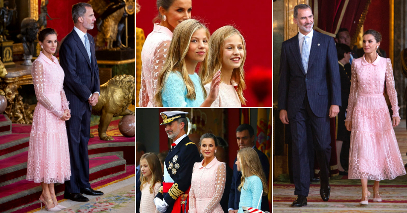 На воената парада, кралскиот пар пристигна со своите две ќерки Леонор и Софија. 47-годишната кралица изгледаше префинето во дамска розова креација од Фелипе Варела, салонки од Стив Меден и чантичка од Магрит.