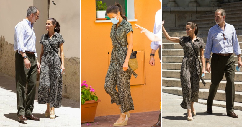 Комбинезонот во сафари стил е од Mango, а Летиција го искомбинира со еспадрили на плута и плетена чанта. При близок контакт со други луѓе, тие носеа заштитна маска.
