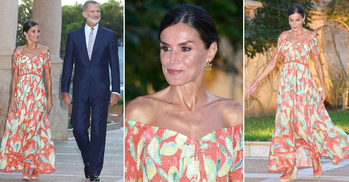 За настанот во палатата Маривент, во близина на Палма, 49-годишната припадничка на шпанското кралско семејство избра летен стајлинг со акцент на портокаловата боја која совршено го истакна нејзиниот тен. Фустанот со кактуси на Летиција доаѓа од брендот Charo Ruiz Ibiza, додека обувките на плута се од Calzados Picón.