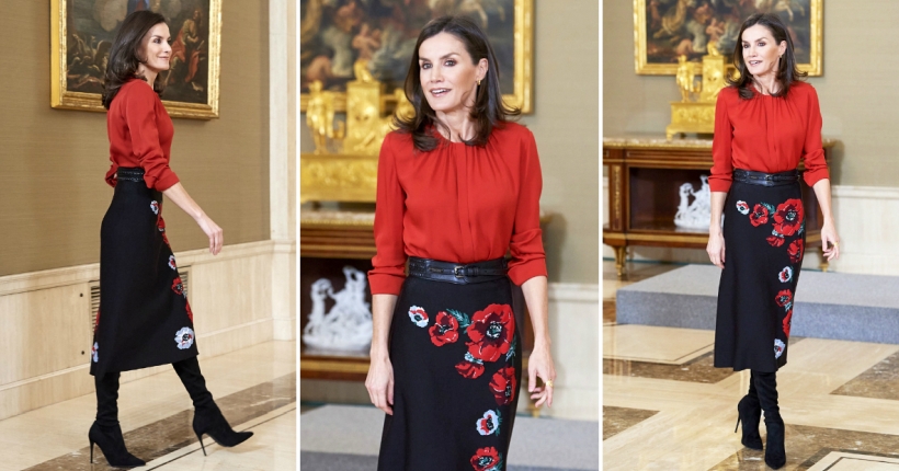 47-годишната сопруга на кралот Филипе ги пречека гостите во женствена комбинација. Цветното миди здолниште од Каролина Ерера таа го искомбинира со црвена блуза од Хуго Бос и високи црни чизми.