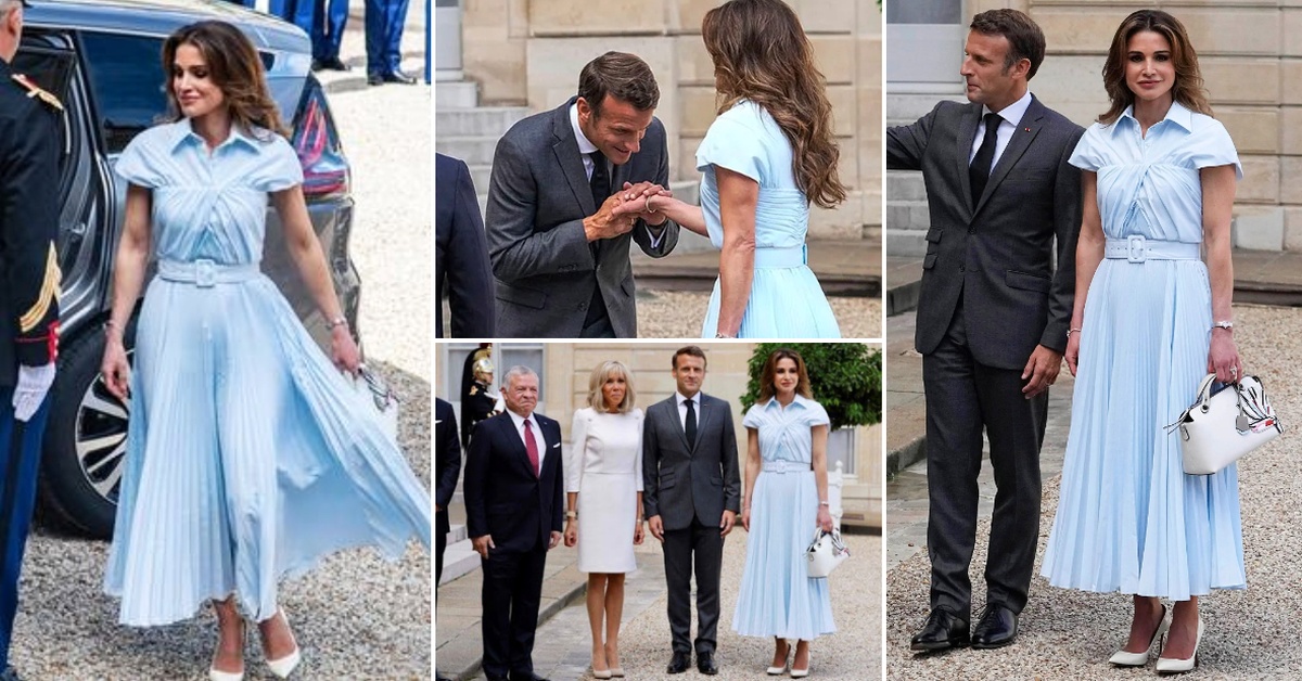 Кралицата Ранија плени со беспрекорен стил. За средбата со Емануел и Брижит Макрон во Париз, 52-годишната кралица на Јордан шармираше во нежен фустан во бебешко сина нијанса.