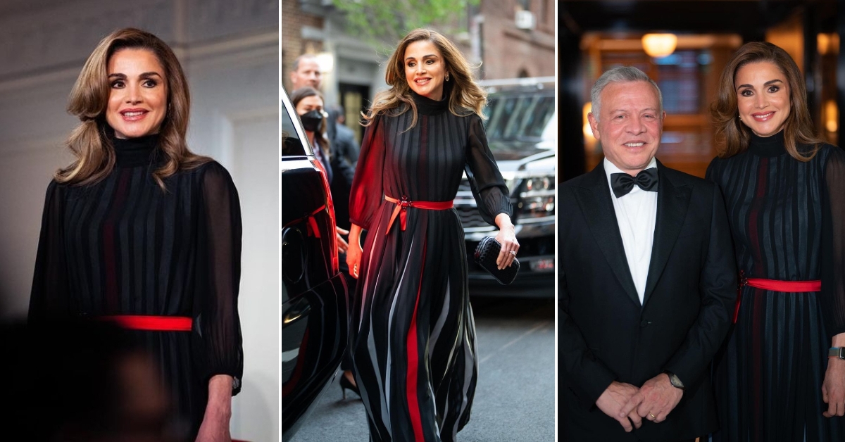 51-годишната припадничка на јорданското кралско семејство зрачеше со елеганција облечена во црн плисиран фустан со црвен колан на половината, кој го надополни со чантичка од Bottega Veneta.